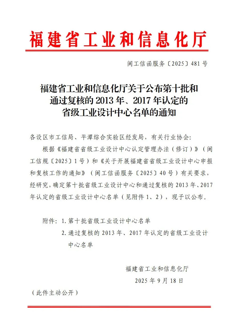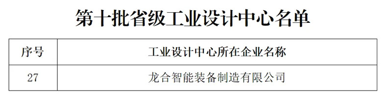 近日,福建省工业和信息化厅公布了第十批省级工业设计中心名单,龙合智能企业设计中心成功入选,荣获“省级工业设计中心”称号。